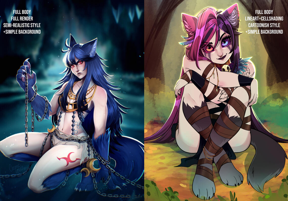 Full Render|Lineart+Cellshading: 550 USD(includes a second version of the same art with few changes on the face and small details so it can bounce using discord or veadotube - open/closed eyes and mouth)