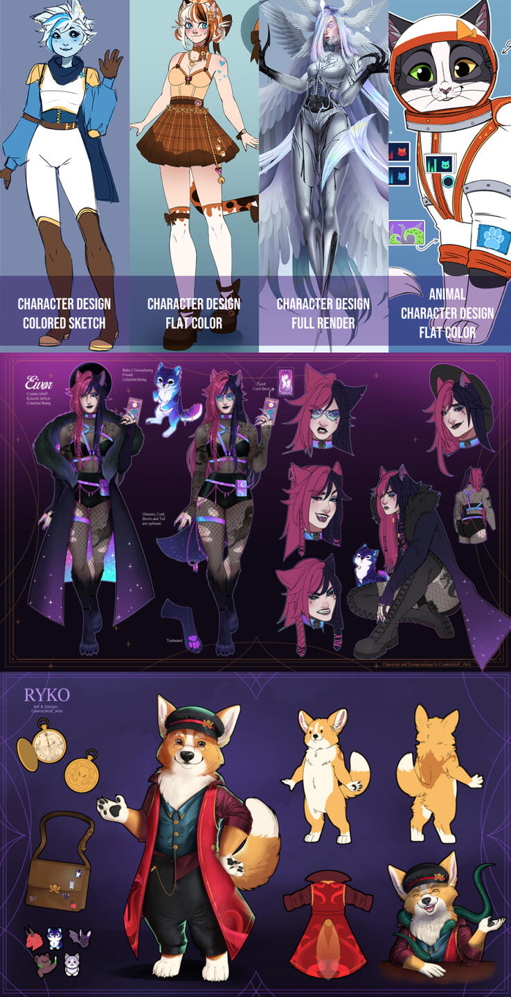 (Smaller pets, inspired by the original design and they may wear simple accessories such as hats, bows, colars, etc)FERAL CHARACTERS:Your character is not a little pet, it is an more complex animal with elaborated body markings and colors and may have more complex accessories, clothing, etcThe price is 50% of the CUSTOM CHARACTER DESIGN and SURPRISE ME DESIGN liested above